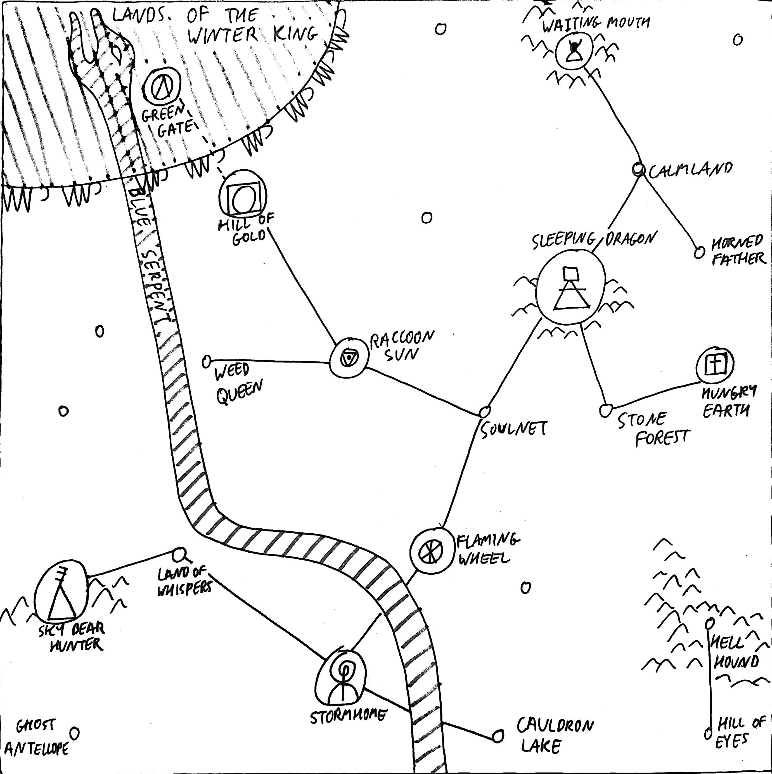 20. Harbok, Gan, and Deneki: These are the goddesses of drums, ideas, and secrets, respectively. “Harbok was the first drummer, drumming on her great belly. Gan goes about cloaked and moans her thought-seeds into the hearts of the chosen. That is how all ideas come to be. Deneki is always watched, for she can see through the dark and silence.”