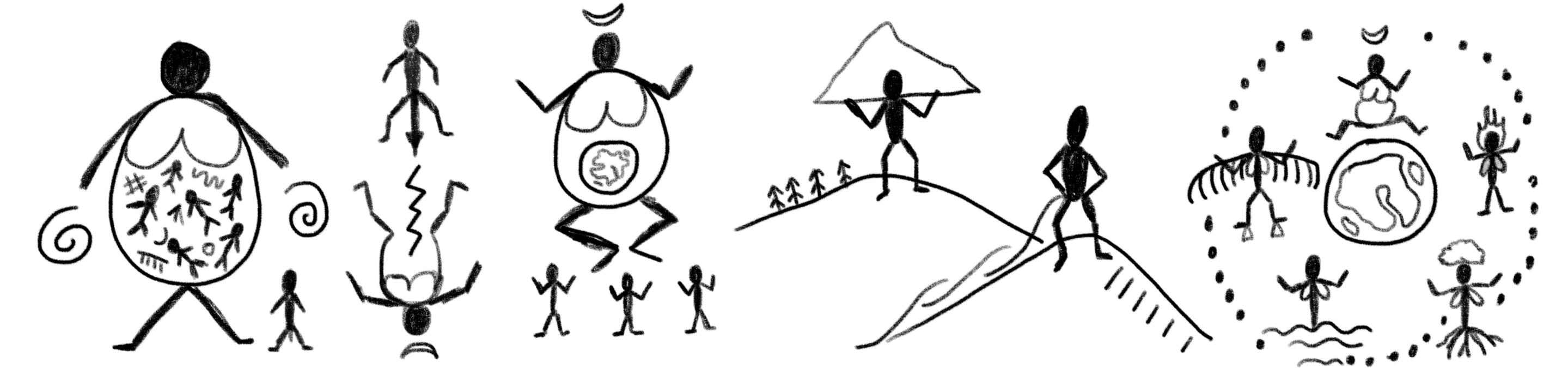From all that was hidden within it, Nir³ came forth. Nir was, is, and always will be.Nir bore An⁴ and Rur.⁵ Rur remained within Nir and was never apart from her. But An stood apart and could not return. Thus, it had been from the first.And An grieved his apartness. He longed to enter again into the wholeness of Nir, as Rur still did. So he sought out Ar,⁶ the Opened One, and found her. He entered her, and she received him. In that joining, Ar was changed, and became Mara,⁷ the First Mother, and they attained Gip-hi-Ah,⁸ the ecstasy by which all things seek reunion.After this act, the most wondrous thing came to pass, for Mara became pregnant and brought forth the First Birth, Nit-Nirket.⁹ Since then, every birth has been an act of creation, for all life enters the world through birth.After Nit-Nirket, Mara bore many more children, who were called the Bella-Bak.¹⁰ One by one, they came forth from her in the shapes of great arms of mud and clay. The Bella-Bak went out across the world and shaped it, so that it would please all children yet to come. They erected mountains and dug valleys. They relieved themselves and so made rivers and lakes. At last, they lay down to sleep beneath a blanket of trees, with the light above them and the dark below.And the eldest daughters, the Nirdin-rosh-Nim,¹¹ watched all this come to pass. They did not join in the shaping of the world. Instead, thirty of them gathered together and danced in a spiral to make the first Outer Council.¹² Therefore, their names are called before all rites, though no one kneels to them.Then others came into the centre and formed the Inner Council: Bab,¹³ Mo,¹⁴ Nanret,¹⁵ Harbob,¹⁶ and Mara. These goddesses went on to bear daughters beyond counting, for life sprang forth wherever they walked and wherever they turned their gaze.These are some of the great goddesses of old:From Bab came Tash, Nelbob, and Suri.¹⁷